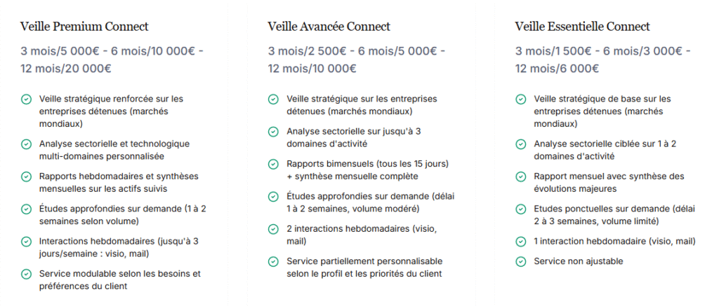 La veille informationnelle inclut une disponibilité structurée tout au long de la semaine ouvrée, avec jusqu’à trois journées de suivi et d’échanges dédiés. Ces créneaux permettent d’apporter des mises à jour, de répondre aux questions et d’assurer un contact régulier, tout en offrant une écoute active dans un environnement en constant développement.